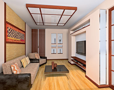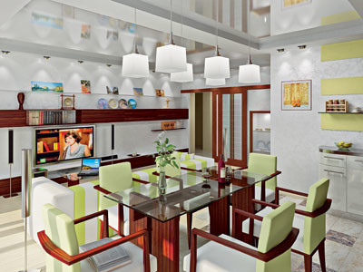 Вид из кухни на гостиную. Над экраном телевизора расположены две длинные полки от стены до стены. Нижняя (MDF, шпон венге)- для книг, верхняя, стеклянная,- для сувениров