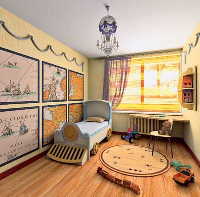 Стены детской декорированы канатами и фрагментами старинной карты мира, под потолком- воздушный шар-люстра, кровать напоминает локомотив