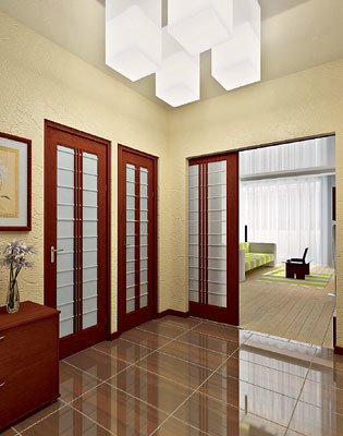 Прихожая. Вцентре потолка сгруппировано четыре светильника с кубическими плафонами- своего рода скульптурная композиция