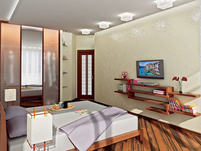 Потолок в спальне родителей понижен на 12см и в него утоплены обычные (не встроенные) светильники.