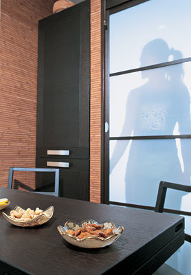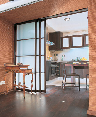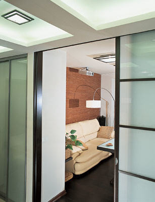 Раздвижные перегородки на роликовых подвесах свободно скользят над полом, благодаря чему гостиная и коридор имеют единое напольное покрытие
