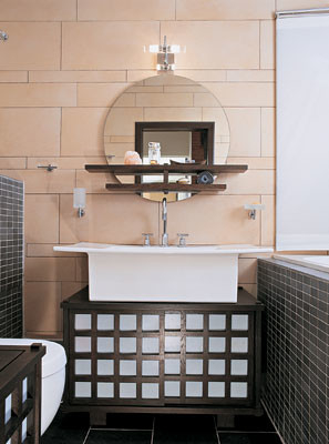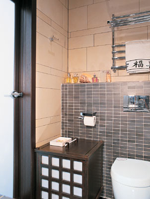 Керамическая плитка разных размеров образует на стенах санузла простой геометрический рисунок