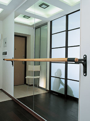 Зеркальная стена зрительно расширяет пространство длинного коридора. Абалетный станок помимо прямого назначения используется как вешалка и поручень