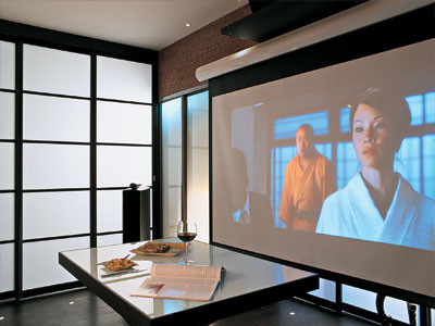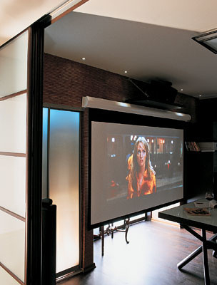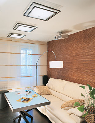 Чтобы подчеркнуть самобытность происходящего и создать иллюзию кинозала, в поверхность пола и потолка по периметру комнаты встроили точечные светильники размером 44см