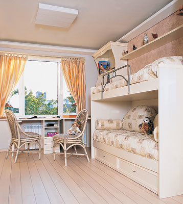 В целях экономии пространства для детской приобрели двухъярусную кровать с выдвижными ящиками