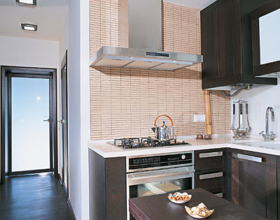 Фасады кухонной мебели, выполненные из темного дерева, перекликаются с «японской» гостиной