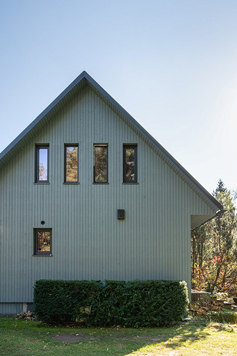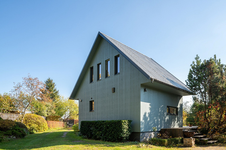 - Наружные стены: деревянные балки сечением 100 × 50 мм, утепление — минеральная вата (100 мм), наружная отделка — дощатая обшивка, краска Teknos