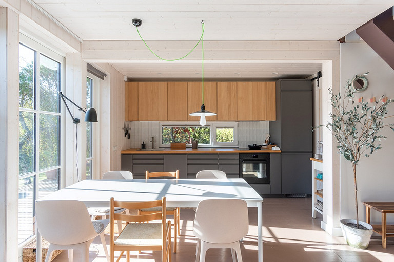 Это удачный пример правильной организации жилого пространства. Здесь есть все необходимое для загородного отдыха, а стеклянные окна-двери визуально меняют пропорции первого этажа, расширяют его и дают полное ощущение единения с природой. Читать далее...
