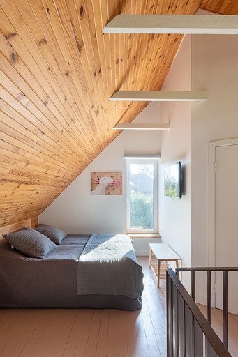 - Внутренние стены: каркасные, отделка — дощатая обшивка, краска Teknos