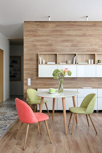 - Мебель: диван SK Design, стеллаж ИКЕА, стол La Forma, обеденные стулья Laska Family