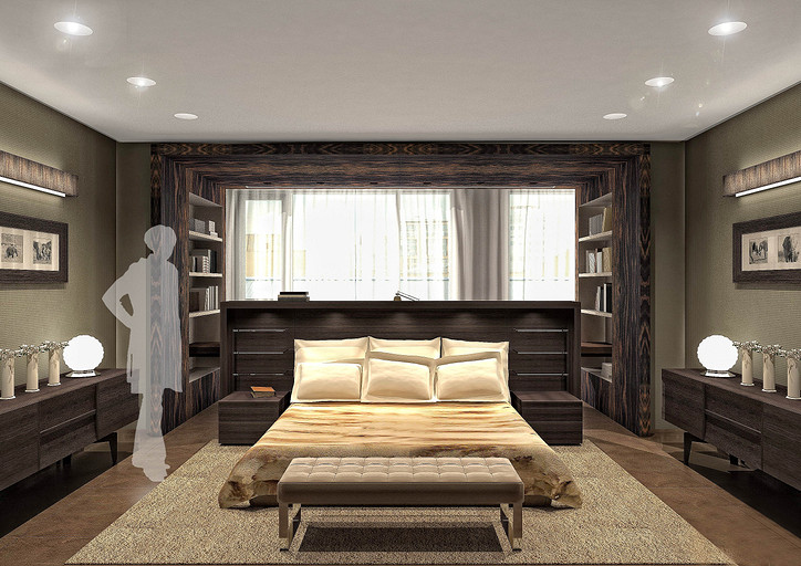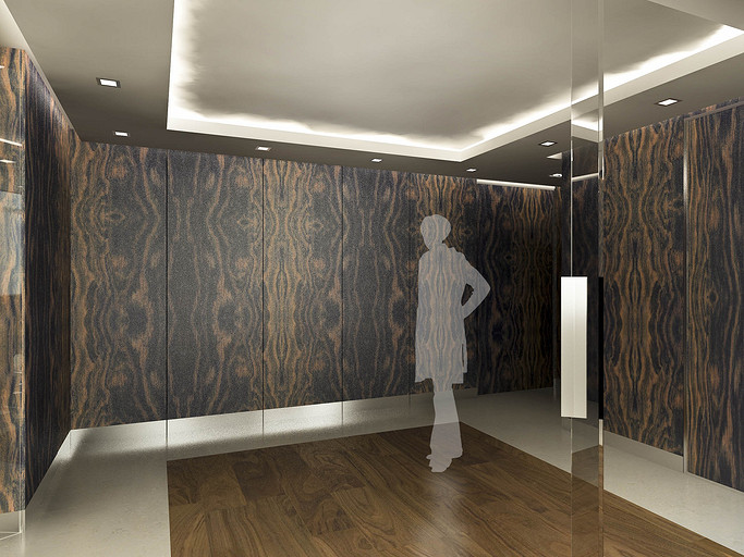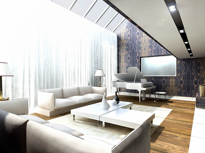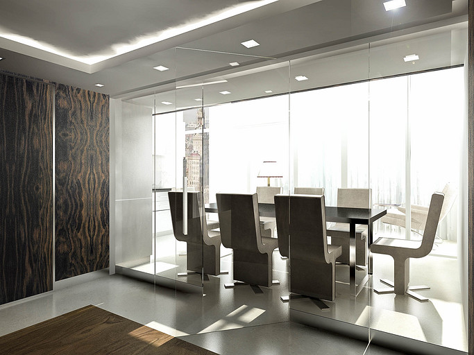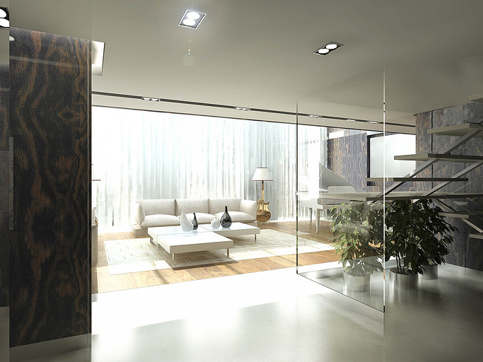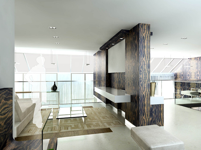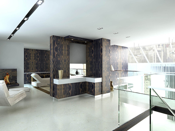 Из апартаментов, расположенных на последнем этаже элитного жилого комплекса «Смольный», архитектор создал ультрасовременный двухуровневый пентхаус, и теперь в распоряжении обитателей этой квартиры смотровая площадка не хуже, чем у Исаакиевского собора. Одной из самых важных задач было учесть интересы заказчика — молодой девушки — известного музыкального продюссера. И с одной стороны это была большая удача, что заказчик любит все смелое и неординарное. Проектируя апартаменты, архитектор поставил перед собой цель — максимально открыть жилое пространство естественному свету. Все помещения в квартире сделали незамкнутыми, сообщающимися друг с другом, чтобы на пути у солнечных лучей возникало как можно меньше преград. Попадая сюда, свет легко распространяется по комнатам. Это особенно заметно на примере прихожей, холла и кинотеатра, которые освещаются панорамными окнами гостиной и находящегося напротив нее кабинета, спальни и зоны у камина. Зонирование в большей части происходит безрамным закалённым стеклом, как отделяю кухню от прихожей, так и, выделяя лестничный спуск, позволяя создать маленький оазис в под лестничном пространстве. Отделка квартиры тоже была подчинена главной цели. Стены белых и светло-серых тонов, сочетающиеся с лакированными пластиковыми панелями Tre-P&Tre-Piu, серия «Planus Sette» отражают солнечные лучи и впитывают цвета улицы. Дверные полотна-невидимки выгодно подчеркивают современность интерьерного пространства. Одновременно на контрасте выходят вперед панельные системы итальянской компании Laurameroni, серия «Stars». Кухонная стенка SieMatic SF10 также лаконична и максимально функциональна. Листы металла, патинированные под дерево придают некую фактурность и задают свой ритм на стенах. Главное в этом проекте — архитектура, выгодно оттеняющая головокружительные пейзажи за окном. Именно поэтому оформление интерьера предельно лаконичное, сдержанное. Все пространство пентхауса окрашено в бескомпромиссно-белый цвет, лишь изредка разбавленный яркими акцентами. Весьма обширной получилась основная спальня хозяйки, сочетающая в себе и спальню и кабинет. Но особенно просторно выглядят гостиная с белым лакированным роялем и домашний кинотеатр на уровне 2-го света. В дополнение ко всему архитекторы разместили в квартире ряд объектов, подчеркивающих увлечения заказчицы — торшеры в виде гитары, сюжетные мозаичные рисунки из мрамора в санузловых пространствах. Все материалы в проекте, что наиболее важно, только натуральные — это мраморные полы из юрского мрамора, массив паркета, как напольное покрытие и стекло. Ну и самой важной нотой в этой симфонии стал открывающийся из огромных окон впечатляющий вид на реку и окрестности жилого квартала «Смольный».