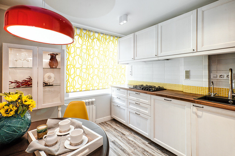 - Мебель: кухня и столешница, шкаф IKEA, стол обеденный на заказ, стулья — реплики Eames