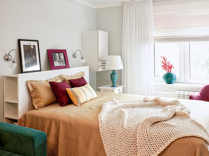 - Мебель: диван, журнальный столик BoConcept, стеллаж, шкафчик, кровать, тумбочка  IKEA, кресло The Furnish, встроенный шкаф — каркас и наполнение IKEA