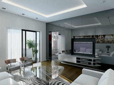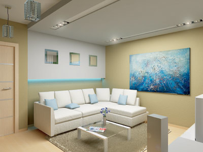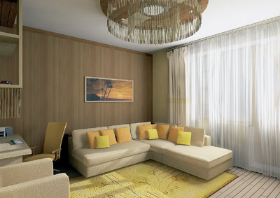 Вгостиной подшивной потолок переходит в настенную панель и заканчивается на высоте 1,3м от пола