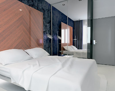 Стена в изголовье кровати затянута иссиня-черным бархатом, подсвеченным торшерами. Авысокая спинка кровати своей текстурированной поверхностью усиливает контраст фактуры