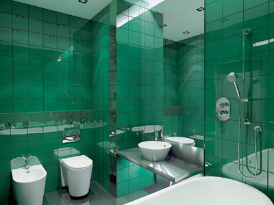 поверхностям темно-зеленых стен ванная комната напоминает декорации
