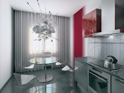 Стена в обеденной зоне декорирована цветовой растяжкой в тон «винным» фасадам кухонного гарнитура