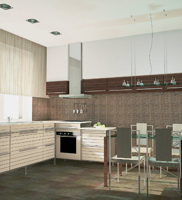 Короб над навесными шкафами многофунк-ционален: прячет воздуховоды от вытяжки, служит базой для встроенных светильников и создает эффект ниши