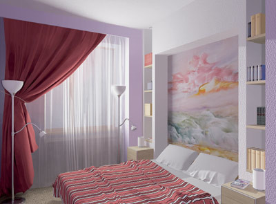 Стена напротив окна декорирована такой же шелковой тканью, из которой сшиты портьеры. Врезультате кажется, что