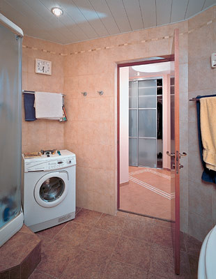 В ванной для установки душевой кабины тоже возвели подиум, в котором расположили трубы подачи и отвода воды. Потолок здесь подвесной, из пластиковых панелей