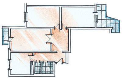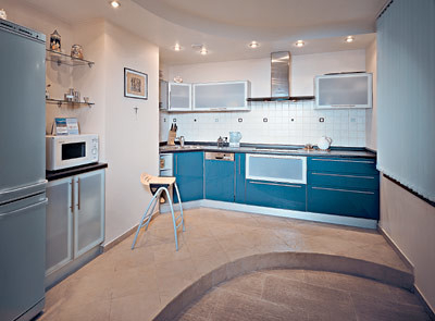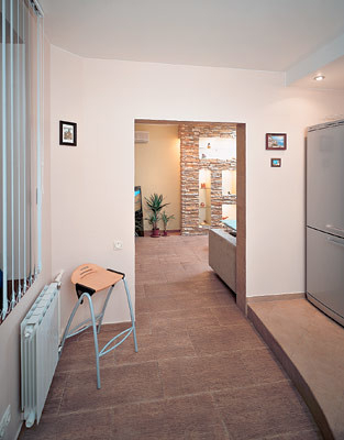 Новый проем между кухней и гостиной скрывает под краской и штукатуркой укрепляющую его массивную металлическую раму. Создание этого проема- отправная точка перепланировки