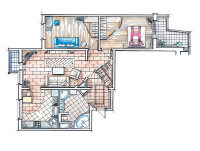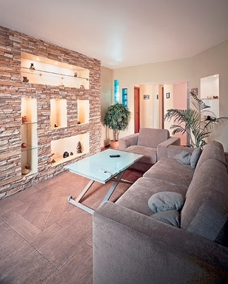Главную стену гостиной украсили пятью нишами, каркас которых сделан из тех же металлических направляющих, что и каркас стенных шкафов, и так же обшит гипсокартоном ("кнауф-листом"). Возведение этой стенки стоило $153, а ее облицовка искусственным камнем- около $215 (материалы и работа)