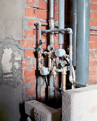 В демонтированном санузле, удалив прежнюю разводку труб, сделали врезку в стояки и смонтировали новую разводку. Установили фильтры, манометры водяного давления, а также датчики расхода воды