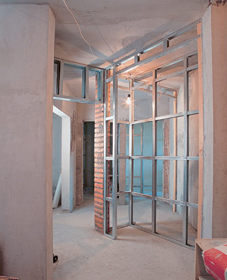 Для каркаса для встроенных стенных шкафов использовали металлический профиль от "КНАУФ ГИПС". Но предварительно возвели опорную колонну (вполкирпича)