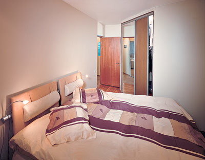 Стены спальни образуют семигранник. Такой комната получилась благодаря встроенной гардеробной. Одна створка
