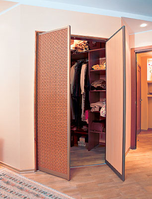 Пятиугольная гардеробная, построенная из блоков пенобетона, очень компактна, функциональна и удобно устроена внутри. При открывании дверей зажигается подсветка, ведь в этой комнате нет окон