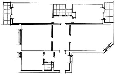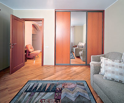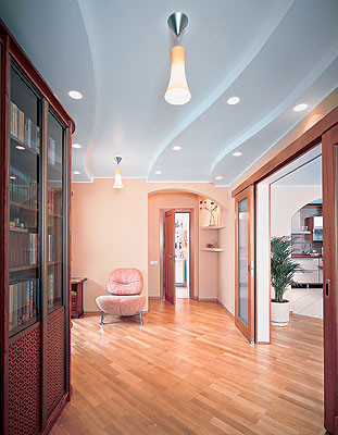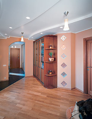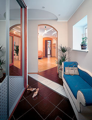Прихожая. Слева- зрительно увеличивающие тесное пространство зеркальные двери шкафа-гардероба. Силуэт арки соотнесен с линией подвесного потолка