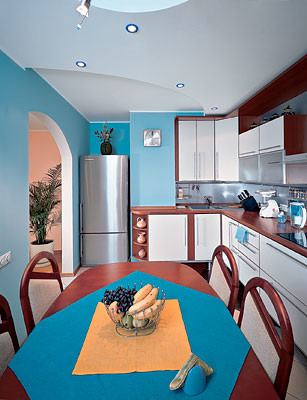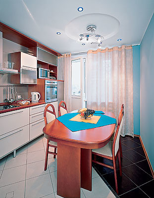 Пол кухни разделен динамичной диагональю на две части, что выглядит эффектно и современно. Карниз для штор в левой части изогнут для того, чтобы свободно открывалась дверь балкона