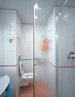 В гостевом санузле удачно обыграны призмы двух коробов- сантехнического (слева) и вентиляционного (справа). Вобразовавшихся нишах установлены унитаз, умывальник и душевая кабина с матовой стеклянной дверью