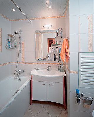 Несмотря на большой сантехнический короб, который ни в коем случае нельзя было демонтировать, в ванной комнате уместились и ванна, и унитаз, и стиральная машина, и умывальник