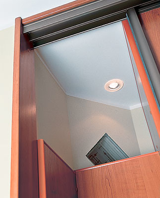 Так выглядит внутренняя конструкция шкафа-купе в детской. Стеклянные блоки выходят в холл, и одной этой лампы достаточно для их подсветки