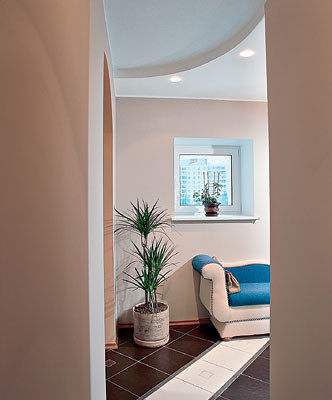 До реконструкции на месте холла был полутемный коридор. Теперь из широкого проема, ведущего в гостиную, и с потолка льются потоки яркого света