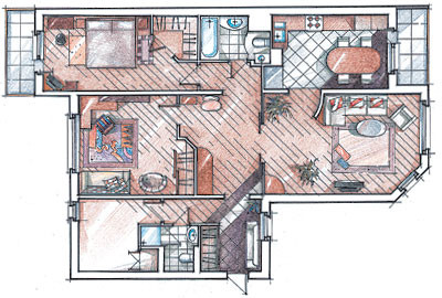 Полы облицованы двумя материалами: темная противоскользящая плитка с нарочитыми неровностями эстетично контрастирует с идеально гладким полем дубового паркета. Граница закрыта слегка выпуклым пластиковым молдингом