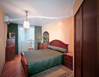 Спальня. Темные узорчатые "индийские" двери справа- вход в маленькую гардеробную. Остальная мебель выполнена в таком же темном тоне. Слева- внутренний блок сплит-системы. Его двойник установлен в детской, за стеной