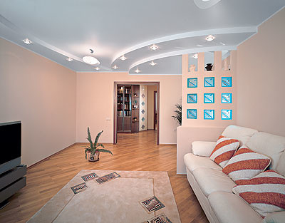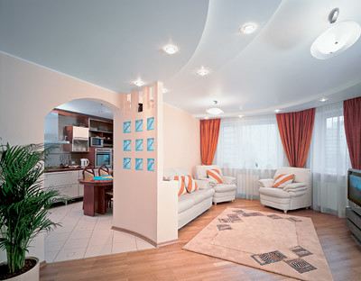 Ступени многоуровневого потолка в гостиной задают маршрут движения из холла на кухню. Авотсеке за декоративной перегородкой образовалась уютная зона диванной