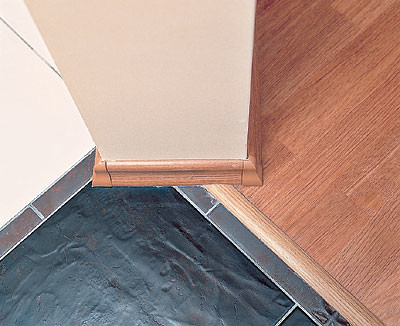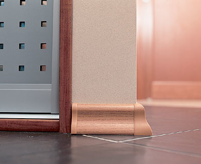 Чтобы плинтус плотно, без щелей прилегал к стенкам, их тщательно, по маякам, выравнивали. Ауглы соединений закрыли светлыми пластиковыми накладками под цвет дуба. Даже маленькие отрезки плинтуса закрыты с торцов пластиковыми заглушками. Дверцы шкафа изготовлены из зеркала и светлого алюминия