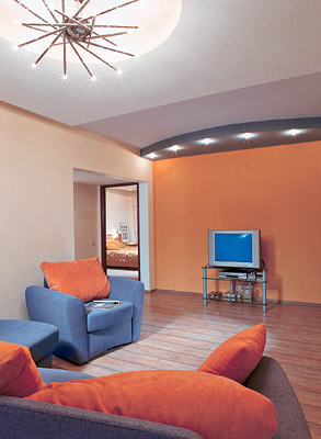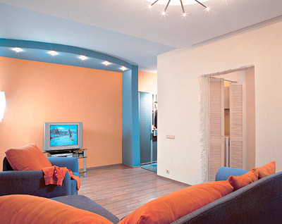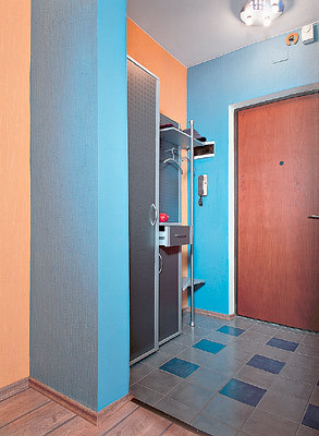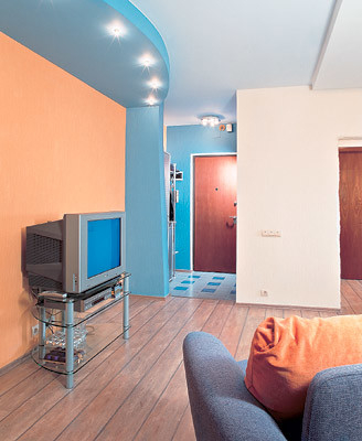 Стена, вдоль которой будет размещена вся техника, окрашена в ярко-оранжевый цвет (краска Beckerplast 3), что привлекает к ней внимание, как к театральной сцене. «Сцена» выделена синим пилоном и козырьком, а соседняя белая стена только усиливает этот контраст