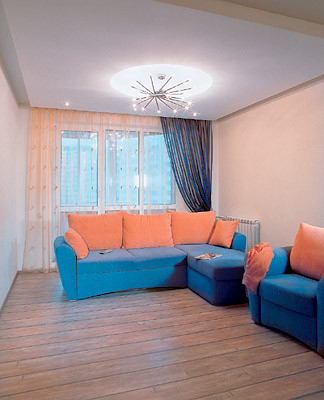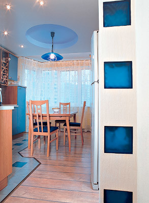 Гостиную увеличили на 7,6м2, присоединив к ней площадь холла. Для футуристической люстры (DZES, Италия) с мелкими лампочками и точечных галогенных светильников (OSRAM) установили понижающий трансформатор. Новый широкий проем, ведущий в приватную зону, усилили так же, как и проем кухни