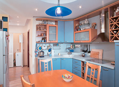 Вся кухонная мебель от «МАРТА» выполнена из итальянского полуфабриката в желто-синих тонах