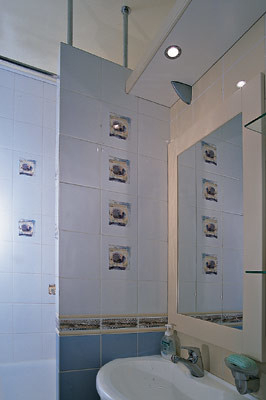 Перегородка не доходит до потолка и связана с ним металлическими тягами, хромированными, как и смесители