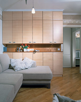 стенкой в гостиной-спальне- гардеробный отсек