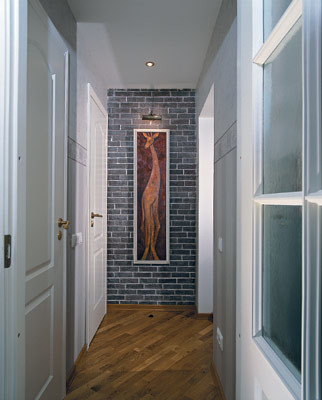 а в широкой штробе, прорезанной снизу, проложили электрокабели. Отделали стену тонкой плиткой, имитирующей кирпич