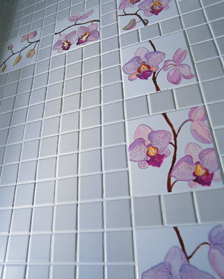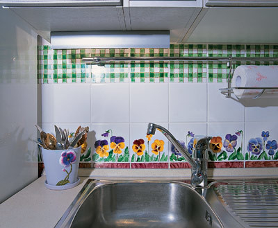 В дополнение к расписному клетчатому "фартуку" хозяйка своими руками создала и длинный цветочный фриз. Написанные на турецкой белой плитке (VITRA) анютины глазки не повторились ни разу, подчиняясь богатой фантазии автора