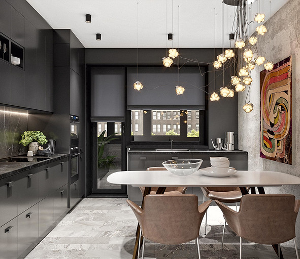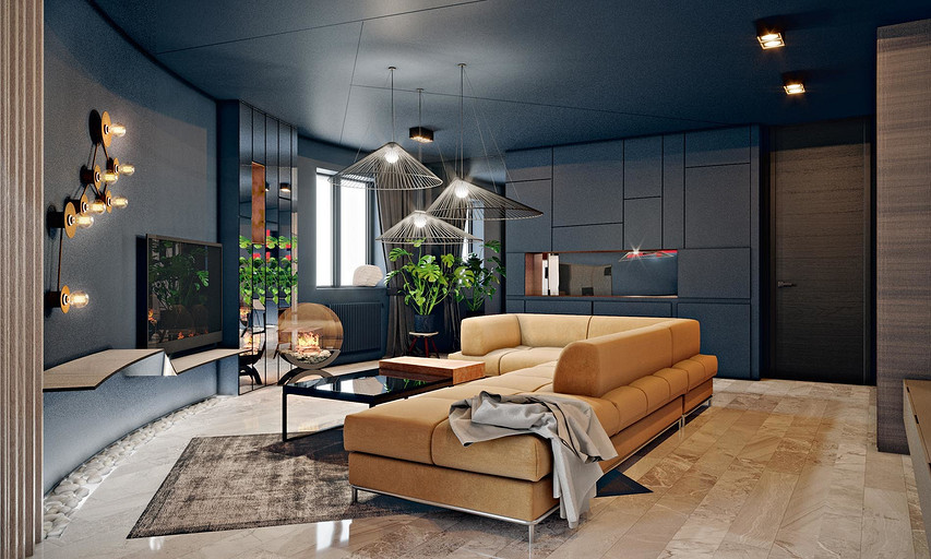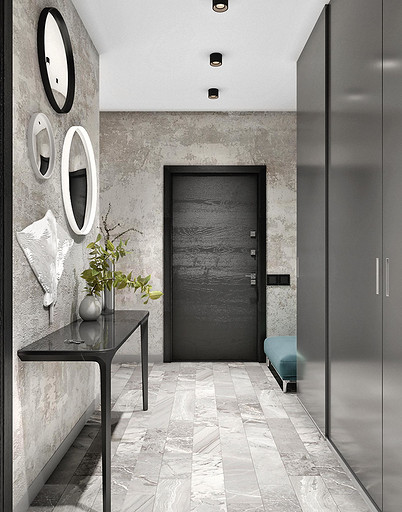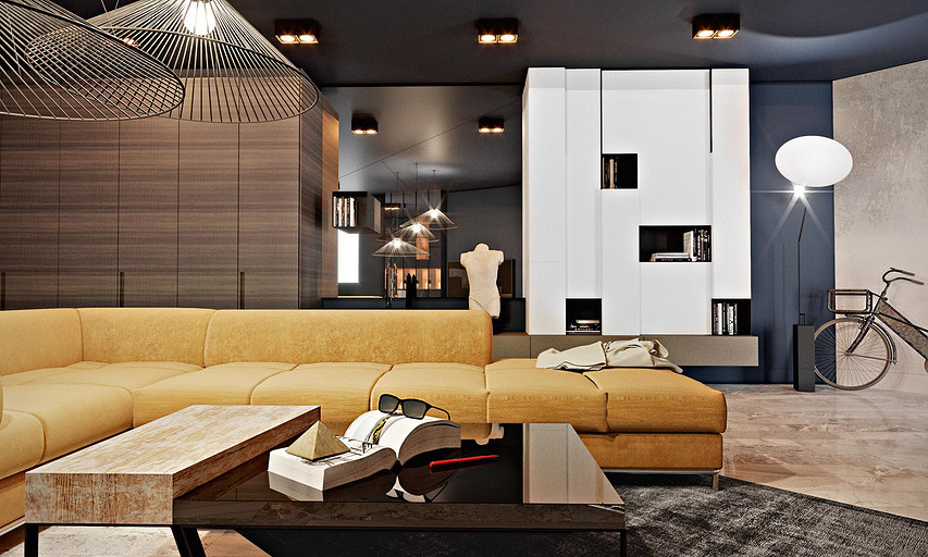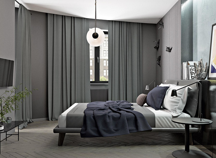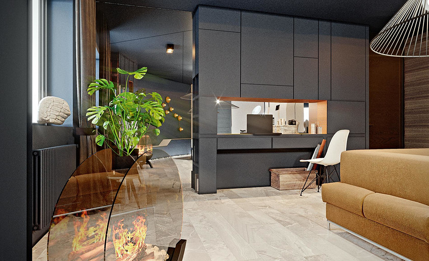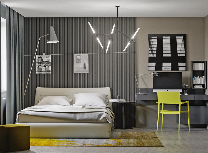 Колористика интерьера построена на оттенках серого с добавлением ярких цветовых акцентов в мебели и декоре. При проектировании упор сделан на чистоту форм и использование арт-объектов как способ индивидуализации пространства.