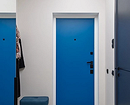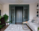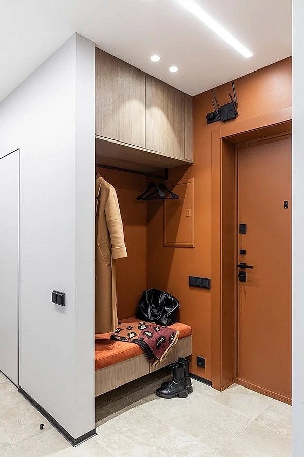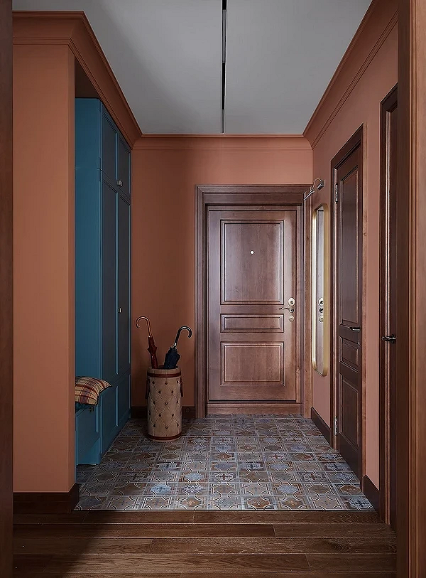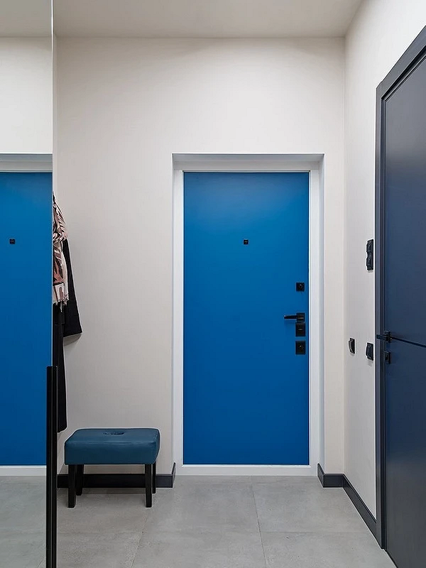 - Акцентная дверь — полотно насыщенного цвета или с выразительной фактурой (например, рельефной). Прием работает, если его поддерживают другие элементы в прихожей: фурнитура, мебель или освещение. В противном случае дверь может выглядеть чужеродно.
