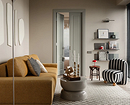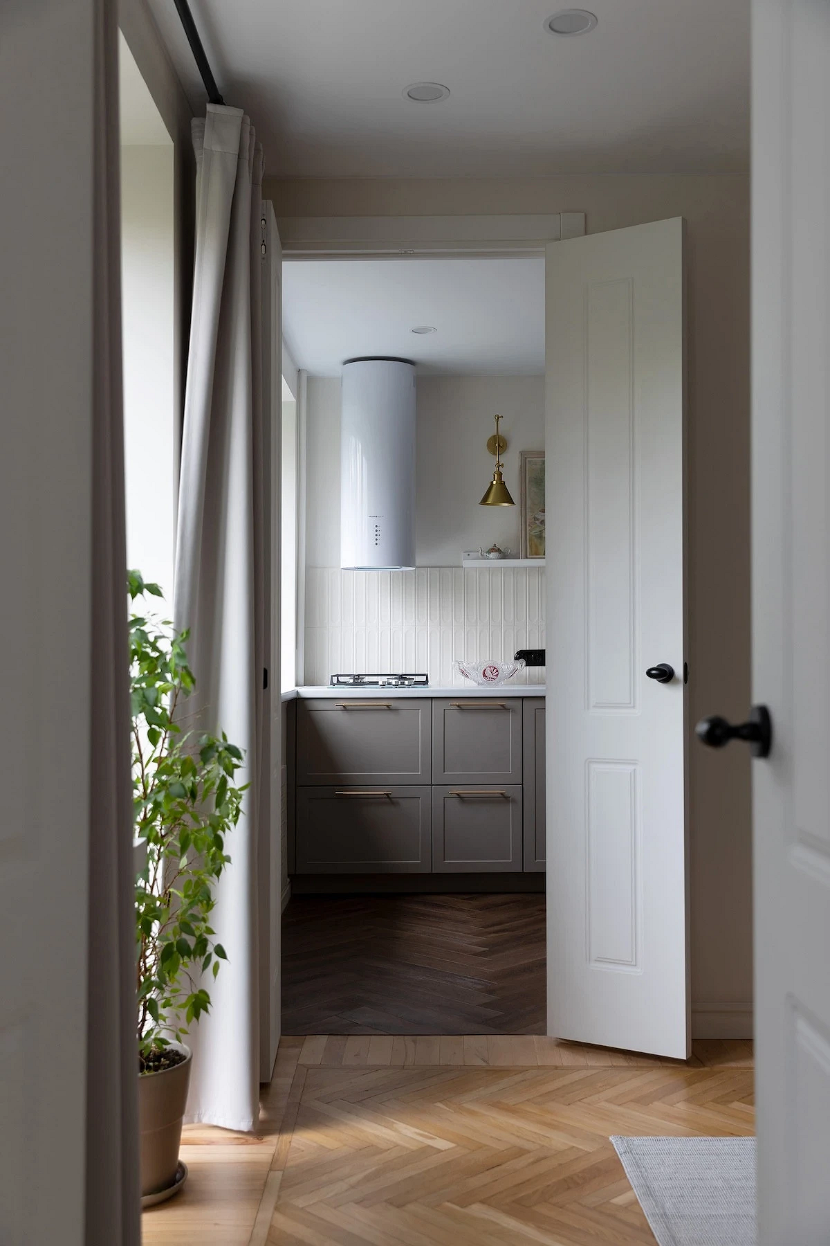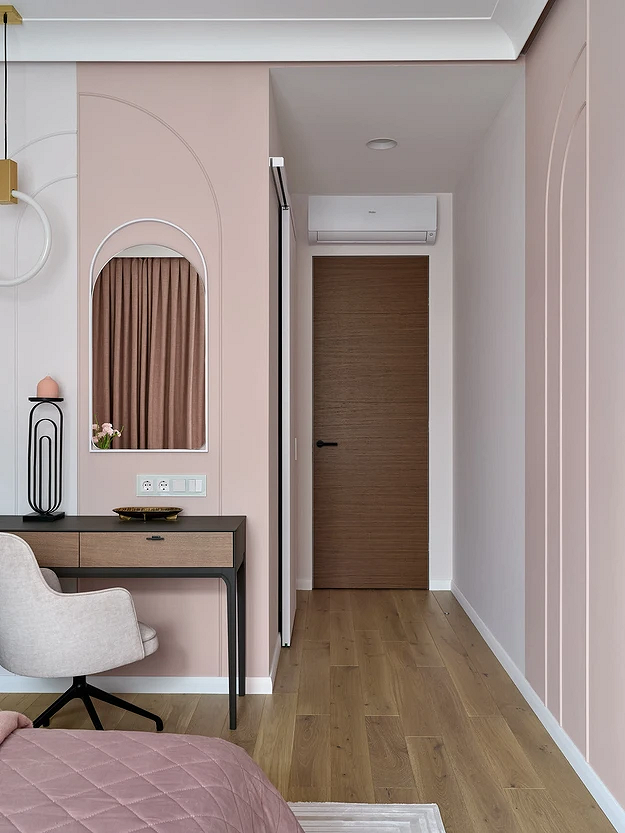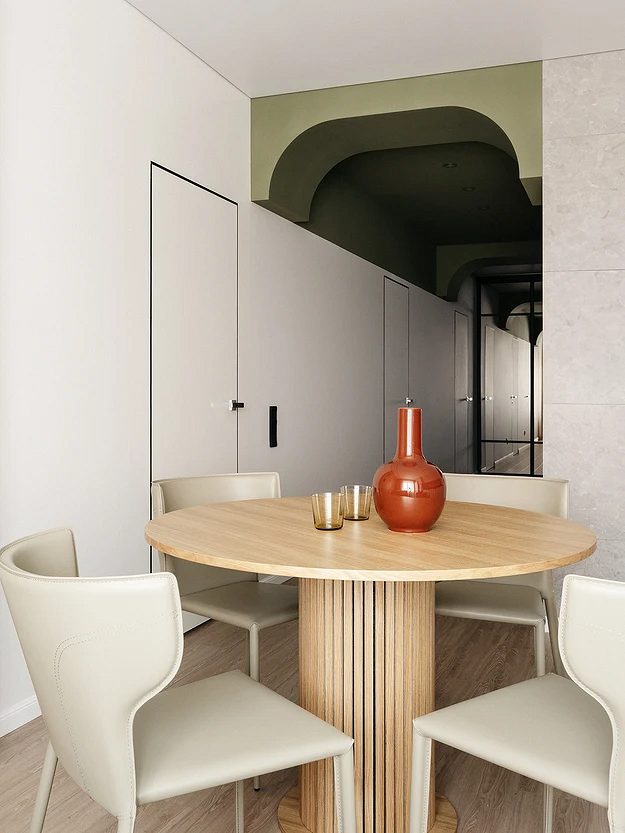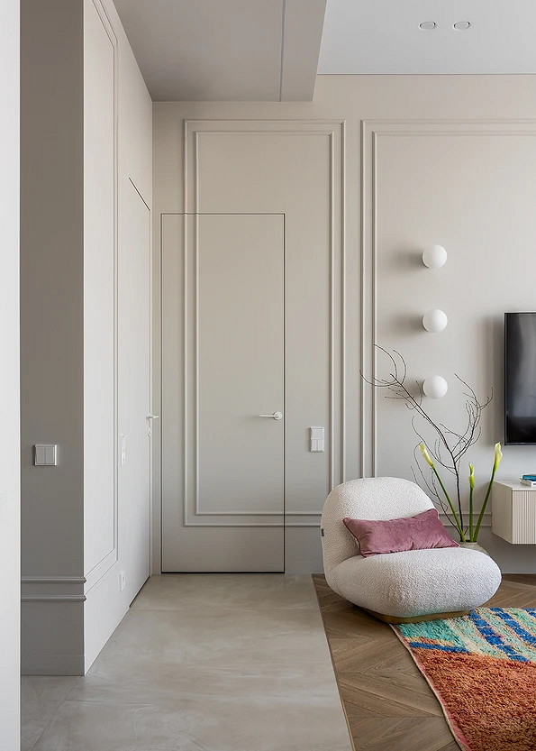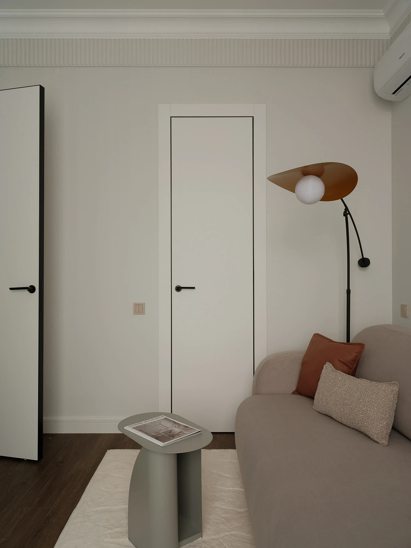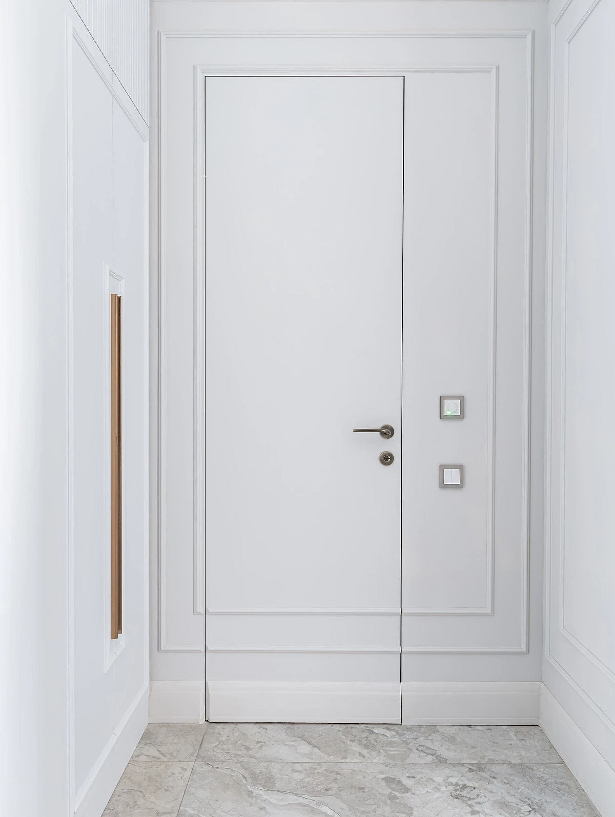 Двери, окрашенные в цвет стен, — один из самых практичных и универсальных трендов. Полотна не выделяются, не дробят поверхность на фрагменты и делают интерьер более цельным. Решение особенно актуально для небольших пространств и длинных узких коридоров.